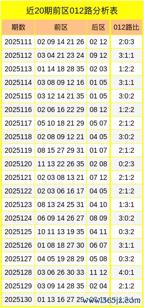 后永诀析:上期后区开出2路+2路的号码02、11,最近20期后区号码012路比为9:13:18。在最近两周的开奖中,后区号码012路比为4:11:13。本期后区012路比参考1:0:1,精选后区:03、05。
